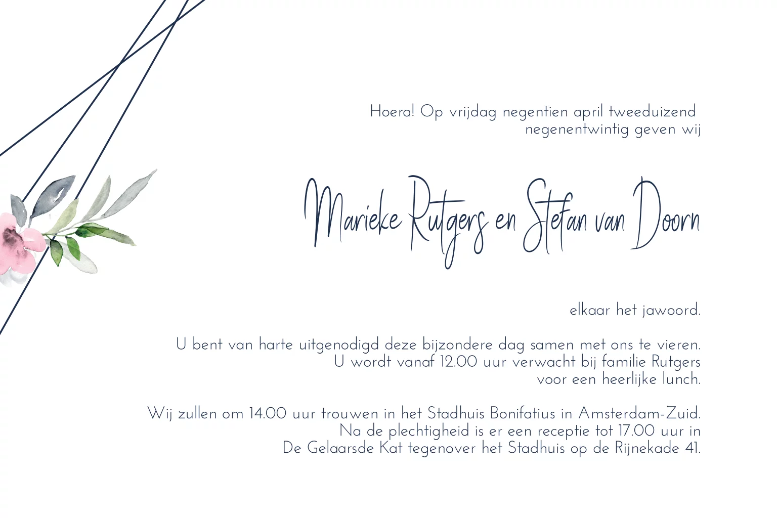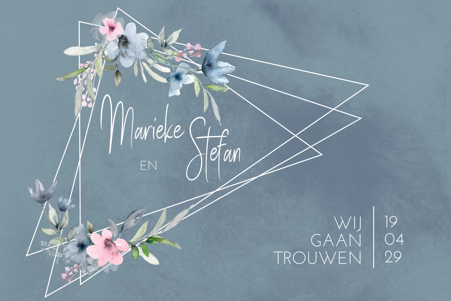 Een blauwe trouwkaart met een mooie combi van een modern geometrisch figuur met romantische bloemetjes. Past deze trouwkaart bij de stijl van jullie bruiloft? Maak dan een uniek ontwerp.