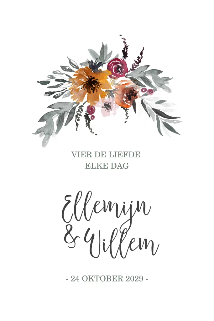 Deze trouwkaart met bloemetjes en blaadjes in roesttinten past bij een bruiloft met veel oude tinten en groen. Houd het bestellen en drukken van trouwkaarten in eigen hand door een ontwerp te maken van deze trouwkaart.Totaalprijs: 0 |