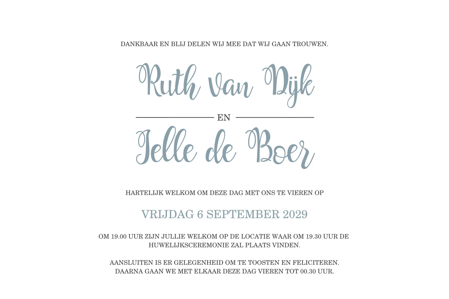 De lettertypes en kleur van de trouwkaart kan aangepast worden in de kaartopmaker. Zo maak je altijd een originele trouwkaart.