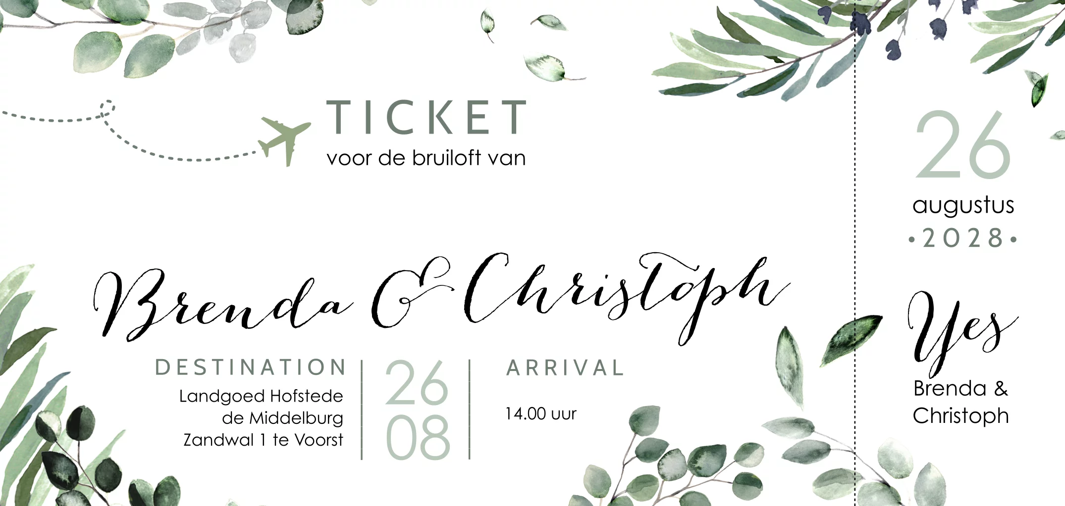 Past een vliegticket met eucalyptus bij jullie omdat jullie veel reizen, in het buitenland gaan trouwen of met iemand uit een ander land gaat trouwen? Dan is dit een mooie trouwkaart als uitnodiging voor jullie bruiloft.