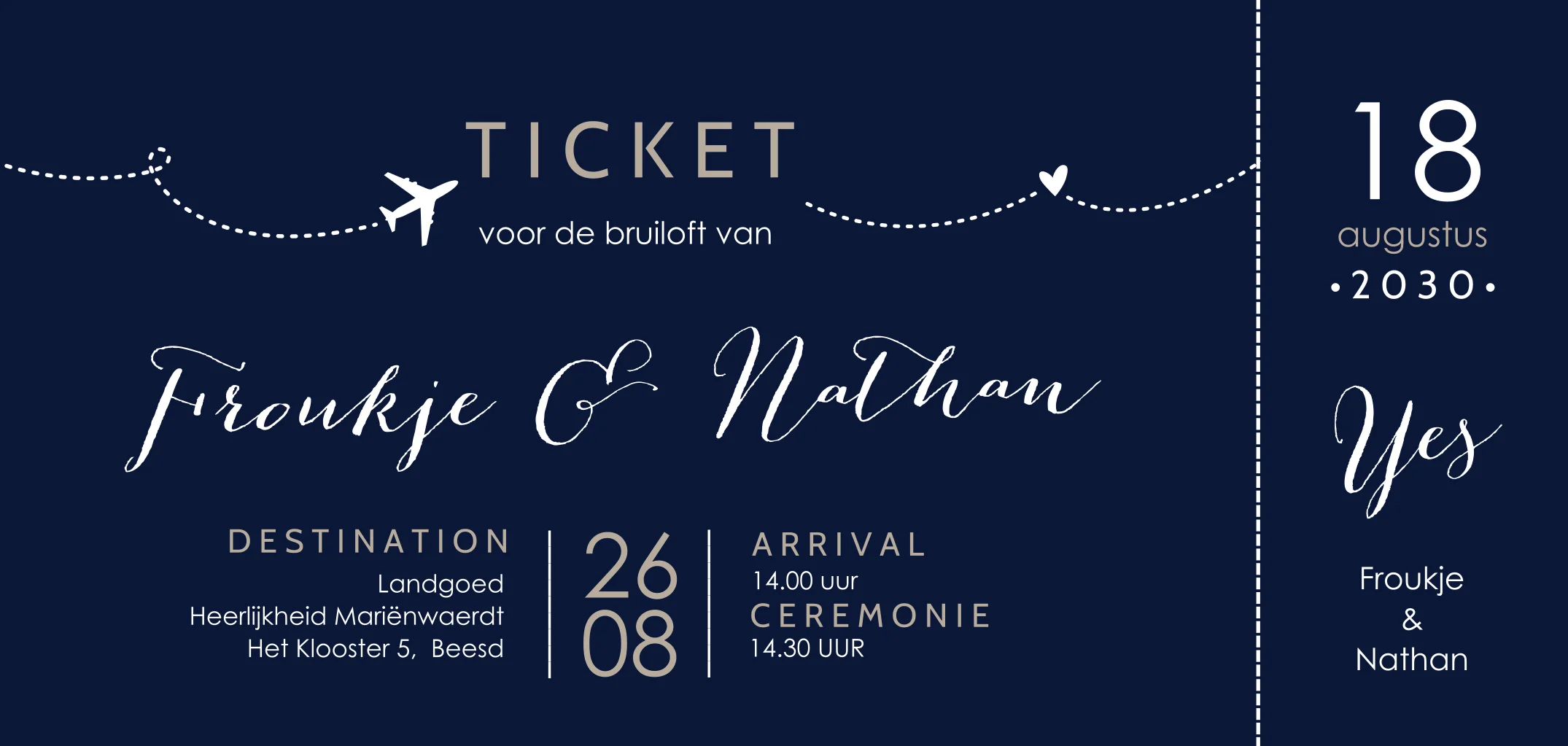 Past een vliegticket bij jullie omdat jullie veel reizen, in het buitenland gaan trouwen of met iemand uit een ander land gaat trouwen? Dan is dit een mooie trouwkaart als uitnodiging voor jullie bruiloft.