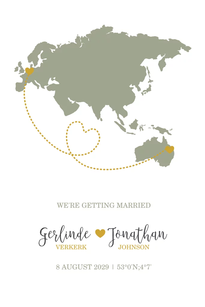 Deze trouwkaart hebben we gemaakt voor een bruidspaar uit Australië. Niet alle landen staan op deze trouwkaart. We kunnen dit aanpassen voor jullie. Kijk eerst eens in de CLIPART in de map met LANDEN want daarin staan meer afbeeldingen van landen en wereldkaarten. Voor een destination wedding kies je deze trouwkaart.