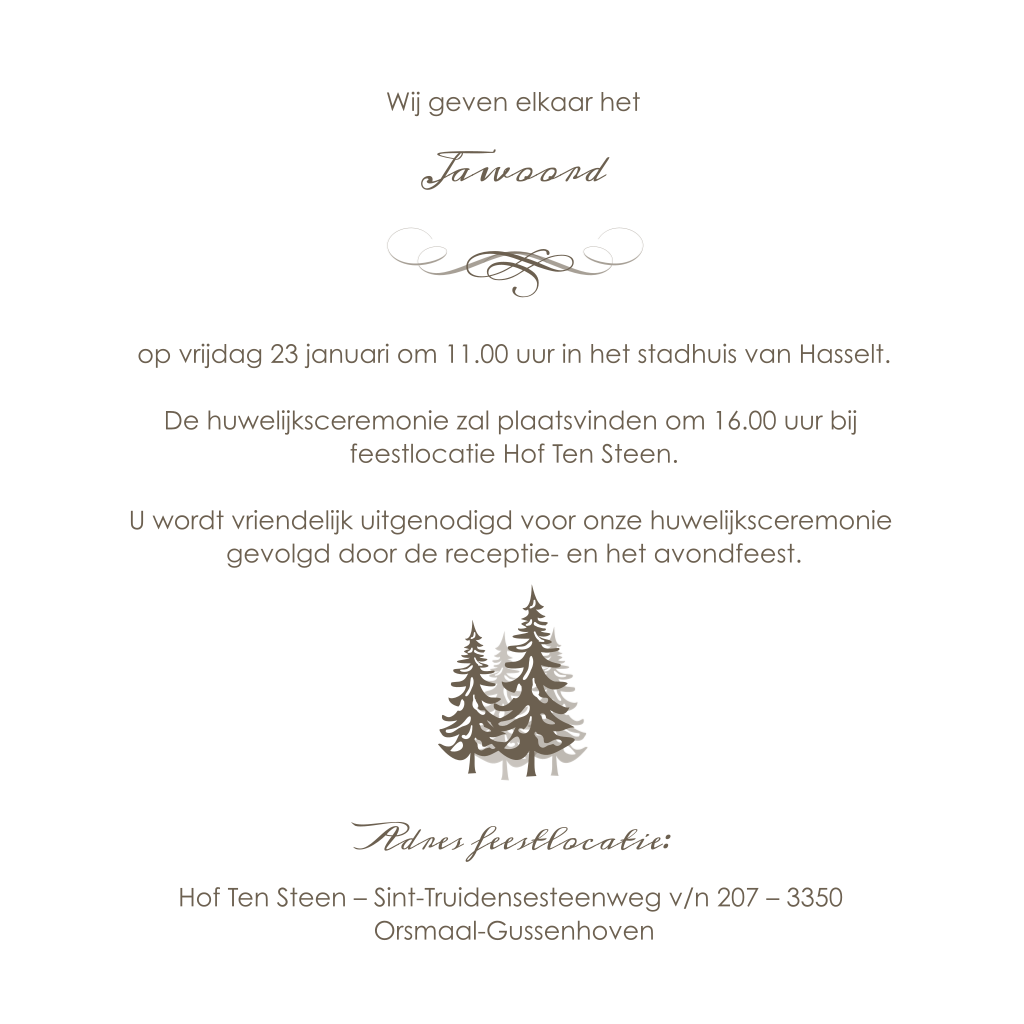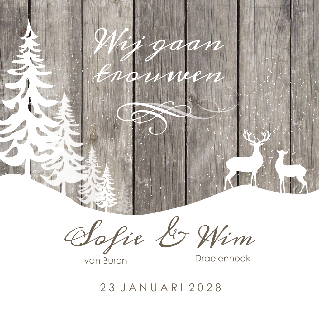 Zijn jullie van plan te trouwen in de winter? Neem het seizoen dan mee in jullie trouwkaart. Deze trouwkaart bevat een uniek ontwerp met kerstbomen, herten, sneeuwvlokken en een steigerhouten achtergrond. De losse elementen zijn te vinden in de editor.