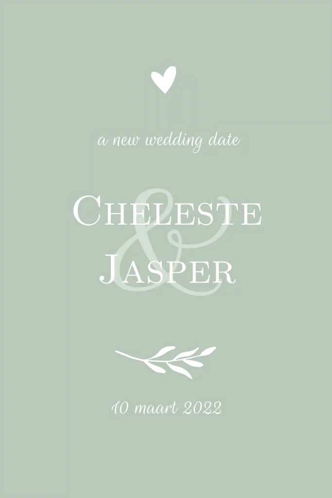 Bruiloft verzet? Maak met dit voorbeeld een mooie Change the Date kaart. Je kunt de teksten en kleuren aanpassen in de kaartopmaker.