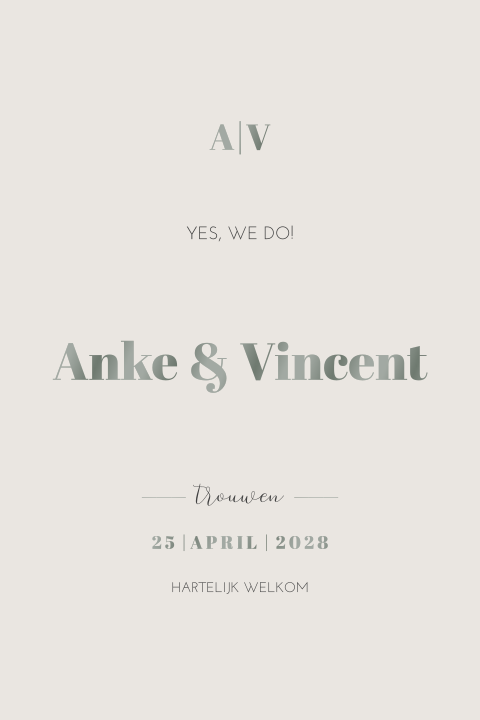 Folie maakt een trouwkaart extra stijlvol. Je kunt kiezen uit meerdere kleuren: goud, zilver, koper, rosé en holografisch. Tekst kun je eenvoudig aanpassen naar folie of switchen van foliekleur. De 1e proefdruk bestel je v.a. €2,50.