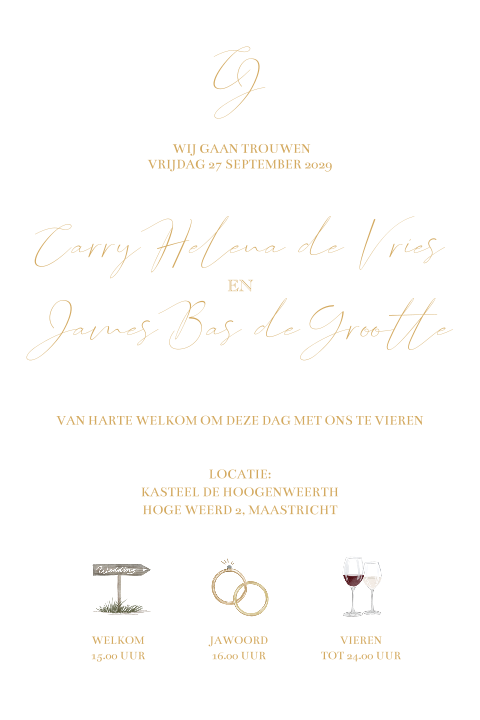 Met trouwkaarten met folie bedoelen we alle kaarten met een goudfolie, zilverfolie, koperfolie, roséfolie of zwartfolie. Het element dat in foliedruk op je trouwkaart staat wordt met echt folie gedrukt. Hierdoor komt het op je kaart te liggen met een mooie glans van folie. Hierdoor is zijn de elementen met foliedruk altijd de bovenste laag van je trouwkaart. Je kunt in de kaartopmaker zelf aangeven wat je in foliedruk wilt zetten en in welke kleur folie je dit wilt drukken.