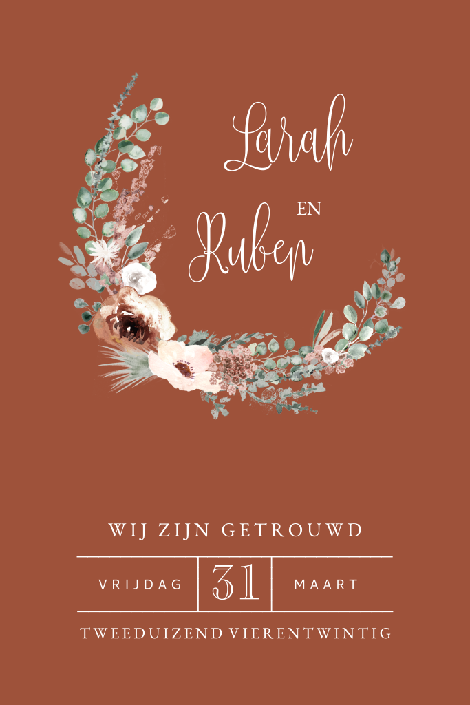 Laat iedereen het weten dat jullie zijn getrouwd. Kies voor deze warme rood/bruine achtergrondkleur. Deze kan eventueel ook aangepast worden in de kaartopmaker.