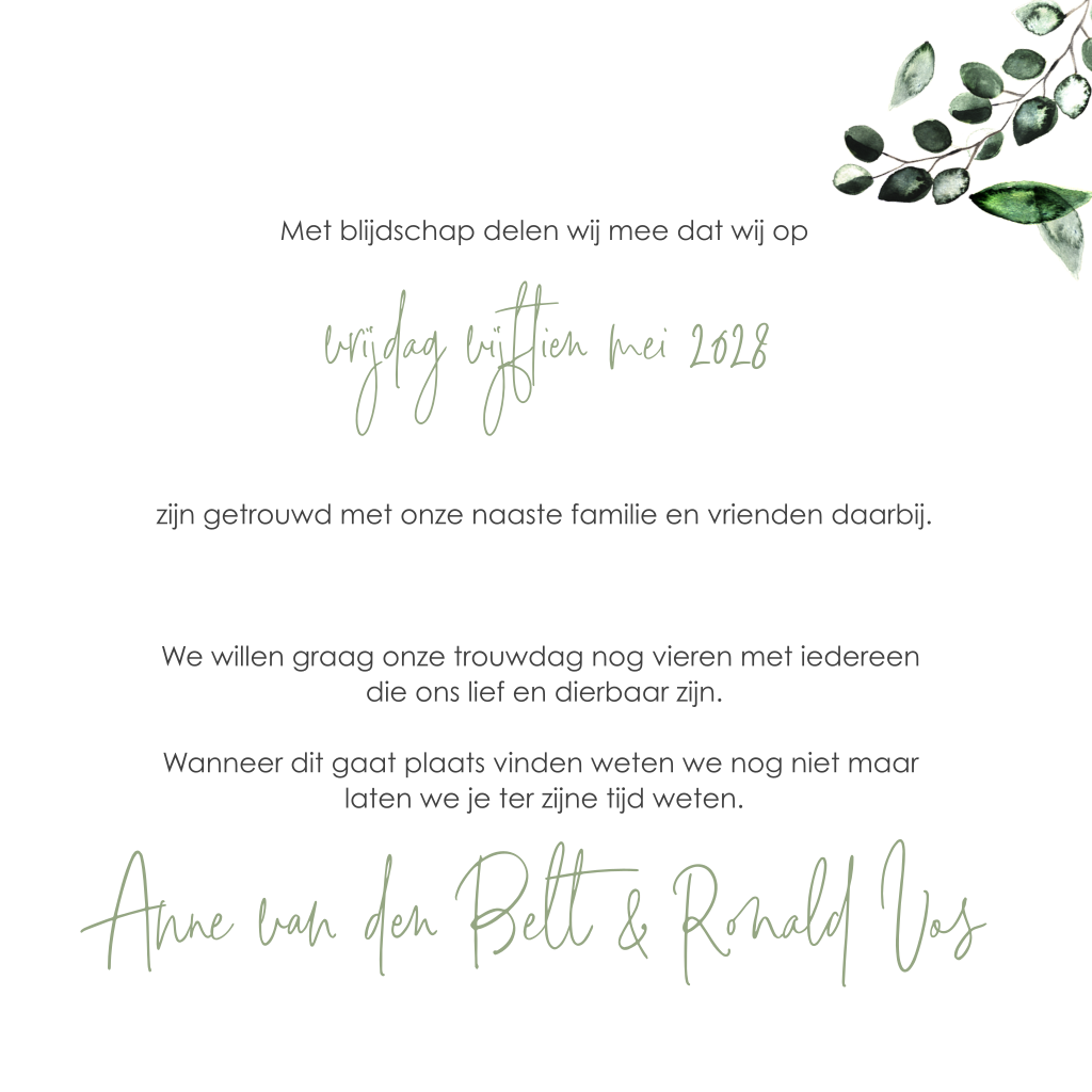 Een mooie dubbele getrouwdkaart met eucalyptus blaadjes en trouwfoto. Aan de binnenzijde kun je een trouwfoto plaatsen.