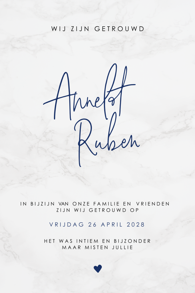Tijdens het bestellen van deze wij zijn getrouwd kaart kun je kiezen uit de formaten: 5 bij 8 cm (niet aan te raden + geen envelop beschikbaar), 10 bij 15 cm, 11 bij 17 cm en 14 bij 21 cm. Jo-Anne adviseert voor dit ontwerp het 14 bij 21 cm. 11 bij 17 cm is ook een mooi formaat. Je hebt keuze uit meerdere papiersoorten en 20+ kleuren enveloppen.