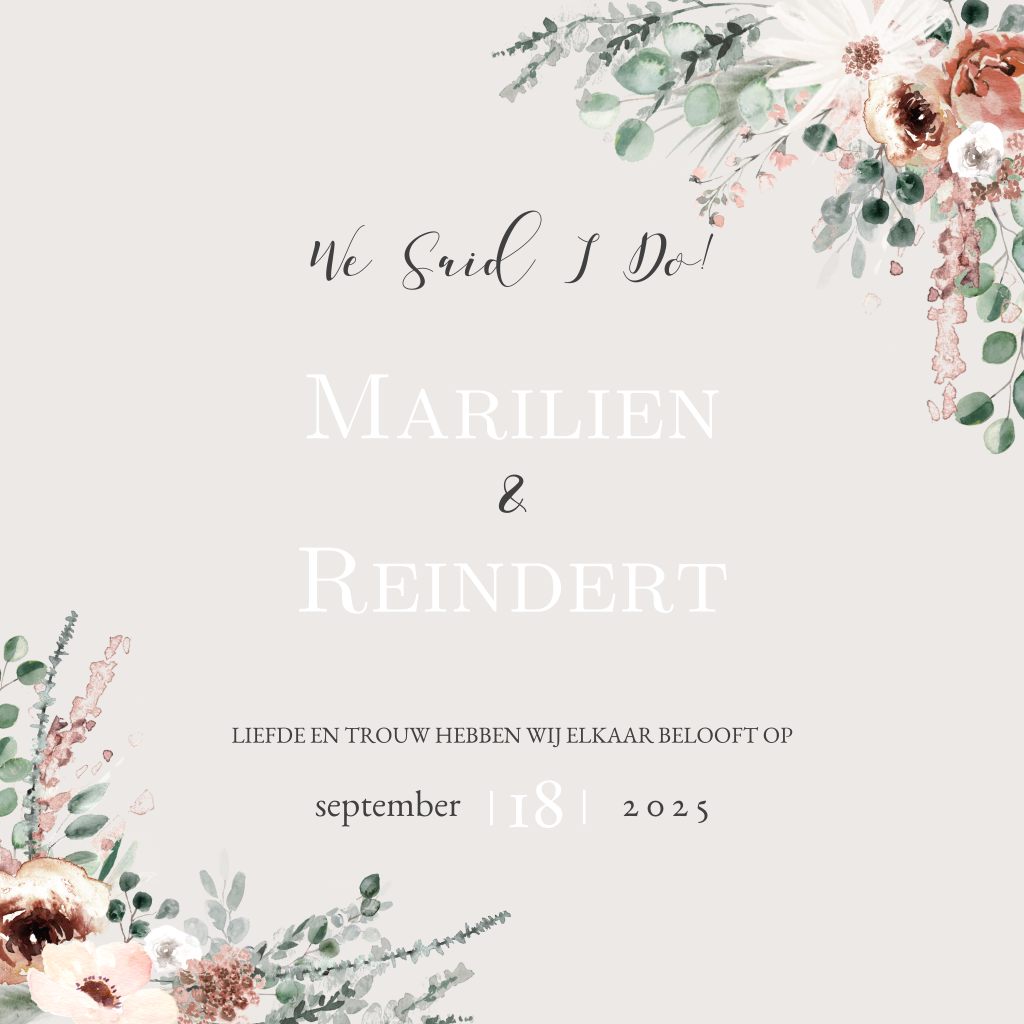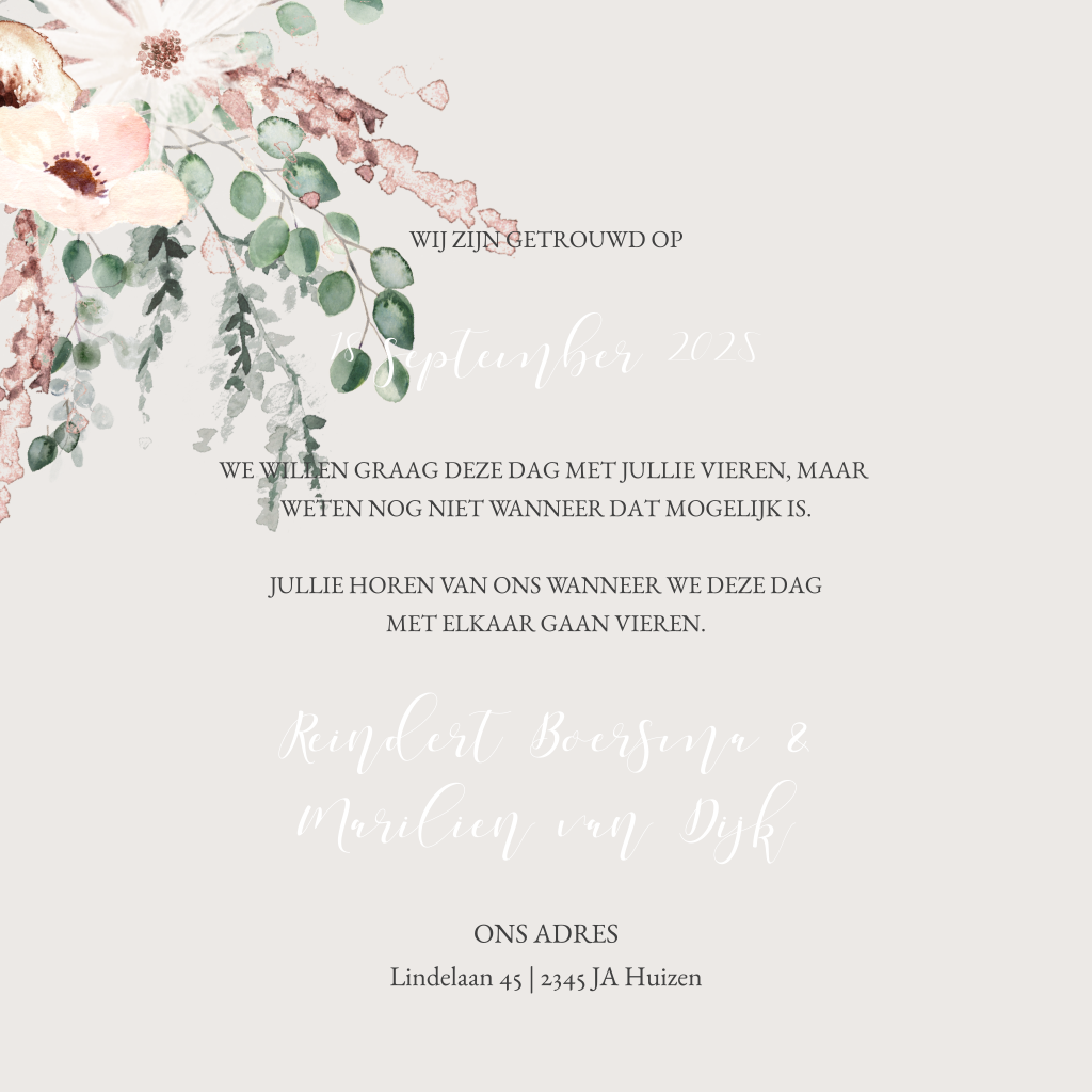 Een Bohemian wij zijn getrouwd kaart met goudfolie en bloemen. Deze kaart past bij de trouwhuisstijl Bohemian Gold en is mooi om te versturen naar familie en vrienden om jullie goede nieuws te delen.