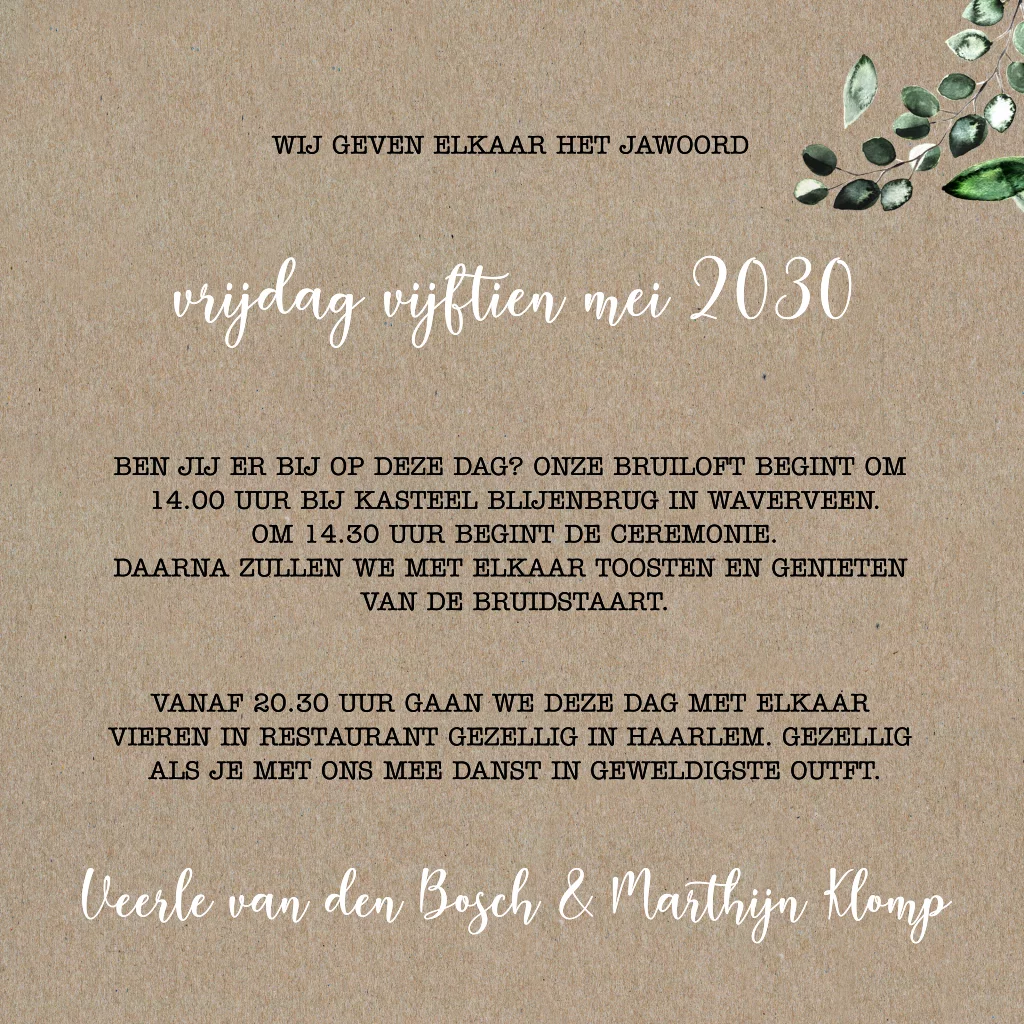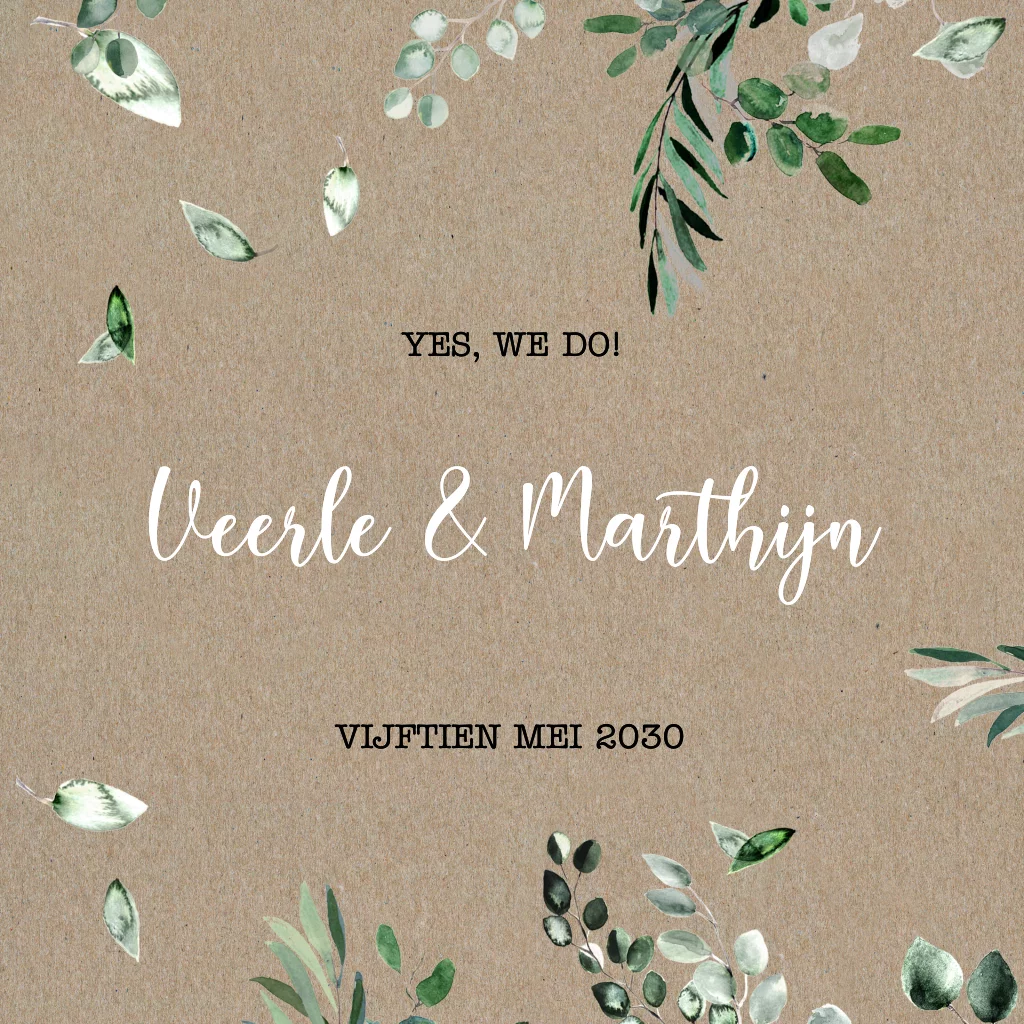 Een botanische trouwkaart op kraft met eucalyptus blaadjes. Deze trouwkaart wordt op echt kraftpapier gedrukt. Dit is een bruin papiersoort met een vintage look. De afbeeldingen van de blaadjes zullen transparanter op de trouwkaart gedrukt worden dan op het beeldscherm te zien is. Bestel altijd een proefdruk!| Totaalprijs: 0 |