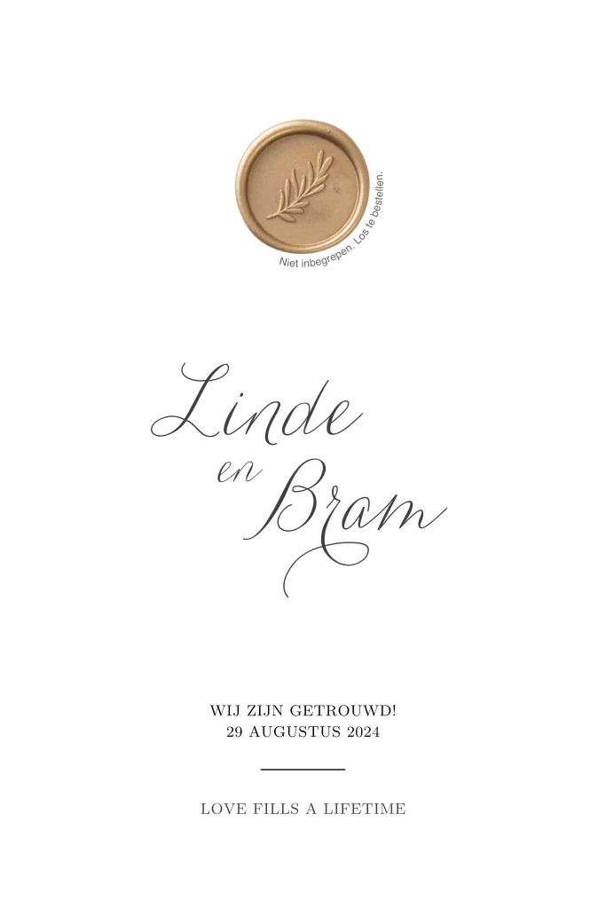 LET OP: De lakzegels bestel je apart bij de kaarten. Je kunt tijdens het bestellen van de trouwkaarten de lakzegels bestellen per 25 stuks. Je plakt deze thuis met de handig plakstrip op de trouwuitnodiging.