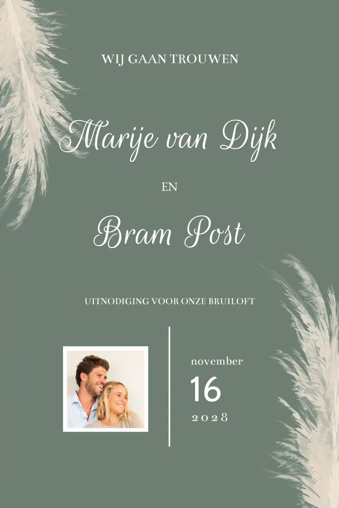 We hebben pampasgras als droogbloem toegevoegd aan deze trouwkaart, maar je kunt ook kiezen uit onze zeer uitgebreide beeldbank.