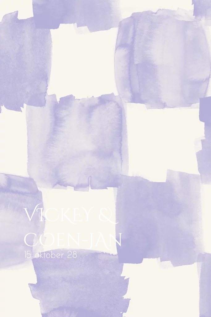 Ontwerp een hippe trouwkaart met paarse blokken. De tekst op voorkant van deze trouwuitnodiging wordt gedrukt in roséfolie.