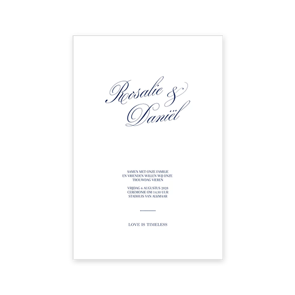 Deze uitnodiging voor de bruiloft heeft sierlijke lettertypes en blauwe teksten. Bij de trouwkaart past een omslag van kalkpapier waarop de afbeelding die op de achterkant staat ook gedrukt wordt. Zo maak je een unieke set.| Totaalprijs: 0 |