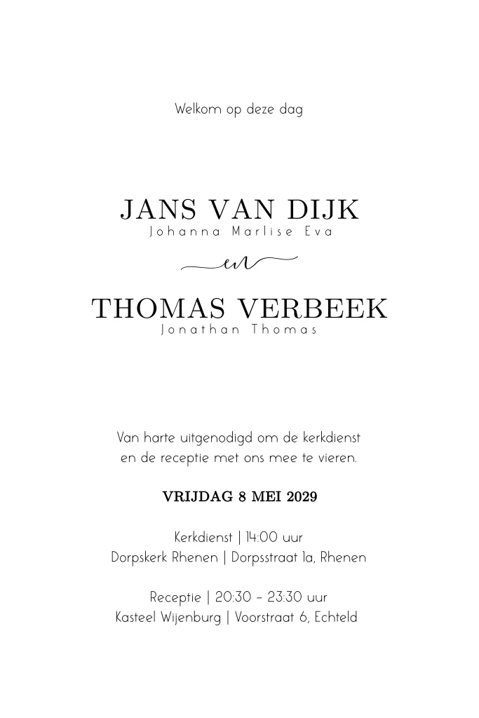 Deze trouwuitnodiging heeft een klassieke uitstraling. Je kunt voor goudfolie kiezen, maar ook een andere kleur folie. Zo maak je altijd de uitnodiging die jullie mooi vinden.