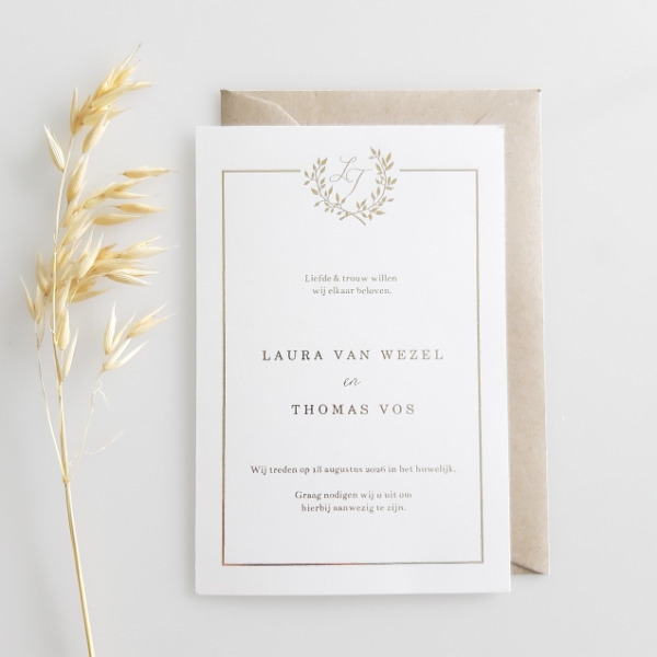 Een enkele trouwkaart met kransje van goudfolie. De goudfolie zorgt voor een glanzende laag bovenop de kaart en een chique look. De kleur van de folie kan aangepast worden naar de kleuren zilver, koper, rosé of zwart. In de kaartopmaker kun je eenvoudig een logo maken van jullie initialen. Voor deze trouwkaart adviseren we het formaat 11 bij 17 cm.