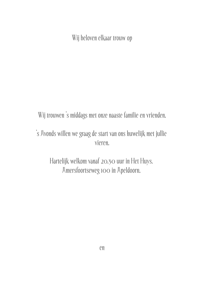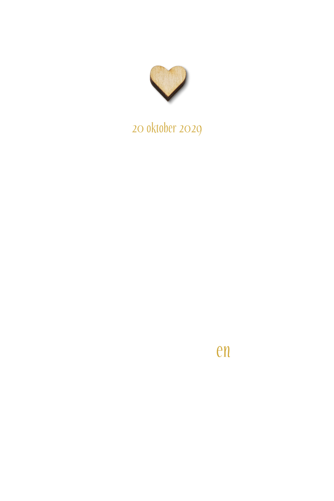 Maak een persoonlijke, klassieke trouwkaart. Dit is een trouwkaart met een houten hartje de teksten in goudfolie. De kaart is dubbel, hierdoor weet je zeker dat er ruimte is om alle informatie te vermelden. Let op! Het houten hartje bestel je los bij de trouwkaart. Je vindt het onder het kopje 'info en service' > 'producten bij kaarten' > 'alle producten'.