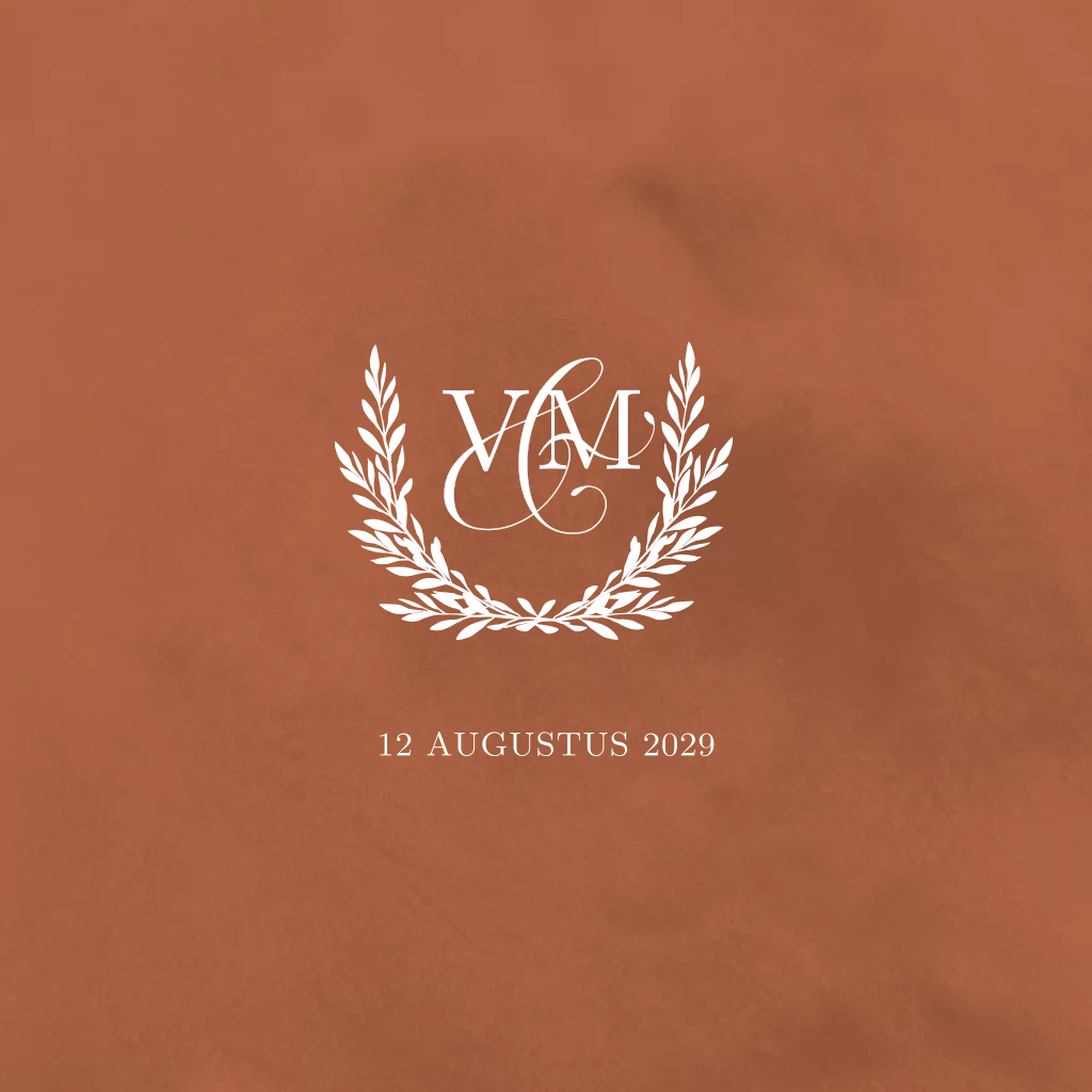 Een klassieke trouwkaart met een kransen en logo in zilverfolie. Je kunt in de kaartopmaker de achtergrondkleur aanpassen. Ook een andere kleur folie kun je kiezen. Zo maak je altijd een stijlvolle en unieke trouwkaart.