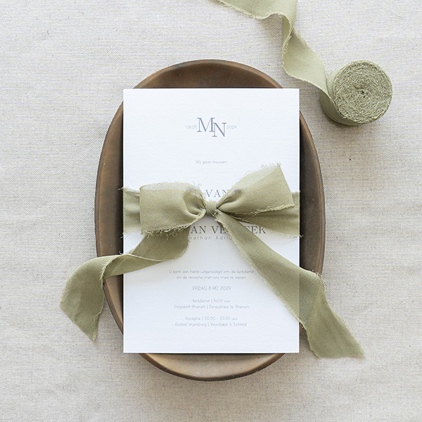 Deze klassieke trouwuitnodiging met logo maakt deel uit van een trouwkaartenset.