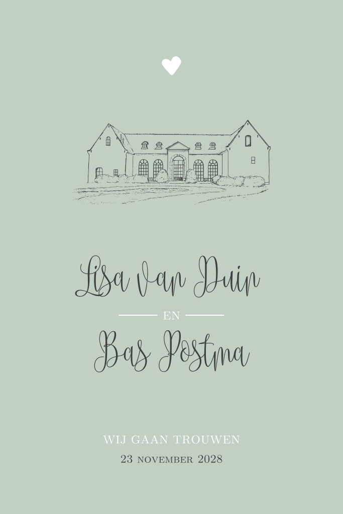 Mintgroene trouwkaart met getekende trouwlocatie