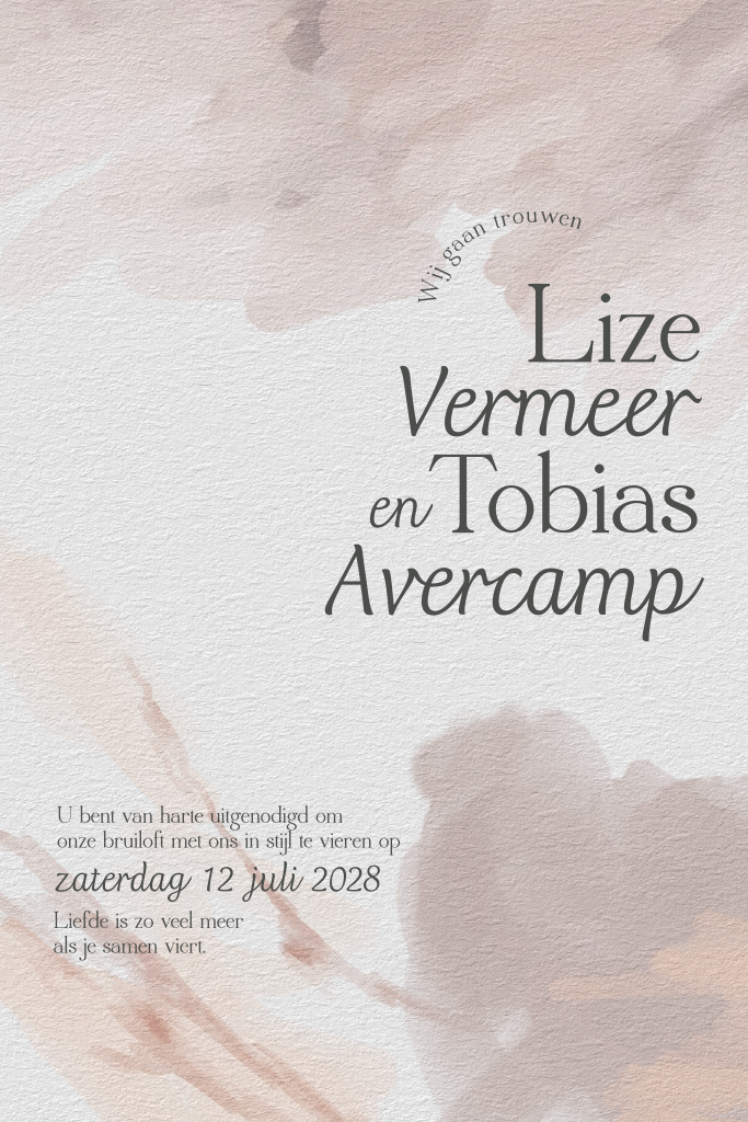 Een unieke moderne trouwkaart met geverfde achtergrond in oud-roze / terra tinten. Met deze trouwuitnodiging kies je echt voor uniek & stijlvol én je bepaalt zelf de teksten op de kaart. Zodat dit de kaart wordt die jullie mooi vinden.