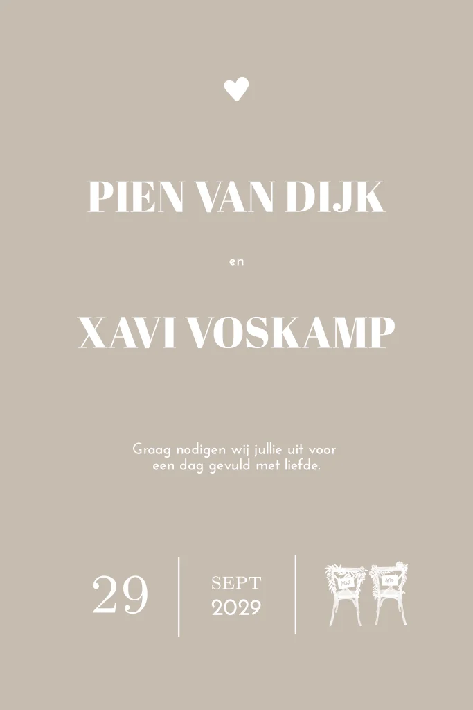 Maak een mooie originele trouwkaart om naar jullie familie en vrienden te sturen. Deze trouwkaart is ontworpen voor bij onze collectie met kalkpapieromslagen, maar kan ook individueel besteld worden. Een kalkpapier omslag geeft een luxe uitstraling. Deze kaart is op zichzelf natuurlijk ook hartstikke leuk. Gebruik onze beeldbank om de kaart te personaliseren en bestel een proefdruk. Heb je hulp nodig tijdens het bestellen van je kaart? Neem dan contact met ons op.| Totaalprijs: 0 |