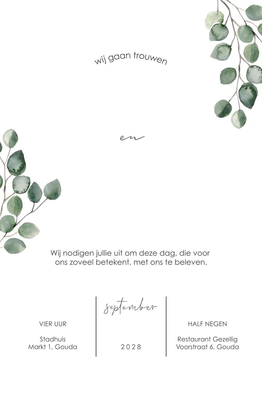 Bestel een trouwkaart met eucalyptustakjes om jullie familie en vrienden uit te nodigen voor je bruiloft. Dit is een trouwkaart met goudfolie die je stopt in een kraft pocket met golvende rand.
