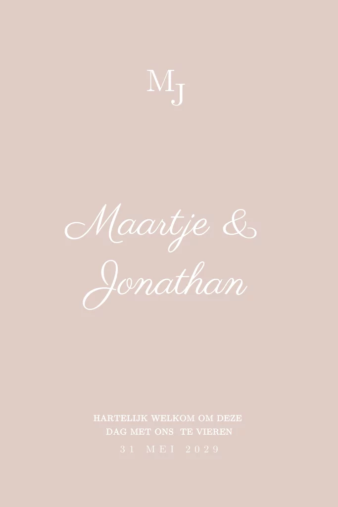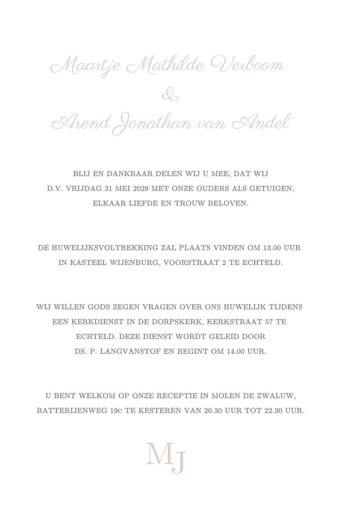 Bestel een romantische trouwkaart voor je bruiloft. Dit is een uitnodiging in roze met een logo van jullie initialen. Het is een dubbele trouwuitnodiging, zo heb je genoeg ruimte voor alle informatie over de trouwdag.| Totaalprijs: 0 |