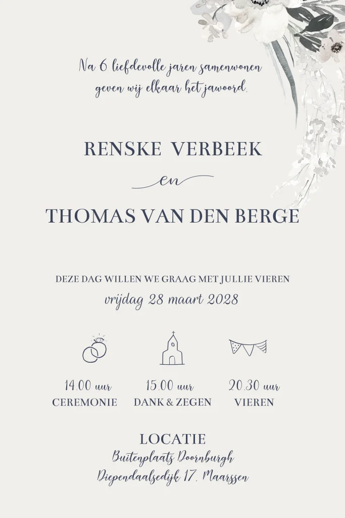 Maak een romantische trouwkaart voor de bruiloft met deze bloemen in naturel tinten. Het kleurvlak kan bij deze kaart niet aangepast worden.