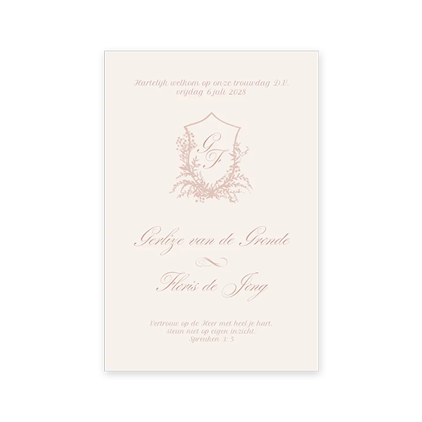 Een echt stijlvolle uitnodiging voor de bruiloft. De achtergrond heeft een zachte tint en op de voorkant wordt een mooi wapen gedrukt. In het wapen kun je zelf een logo maken met jullie eigen initialen.