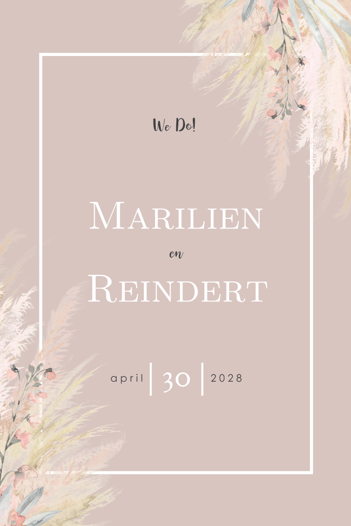 Een stijlvolle trouwkaart met droogbloemen. Onze zand envelop past mooi bij deze trouwuitnodiging.