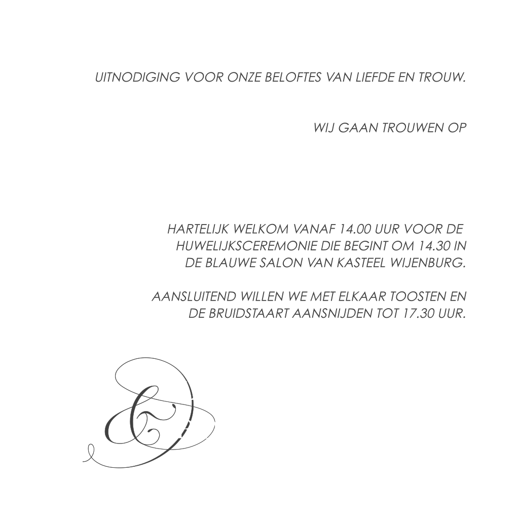Aan de binnenzijde kun je alle teksten aanpassen voor jullie bruiloft. Je kunt deze kaart bestellen in verschillende formaten.
