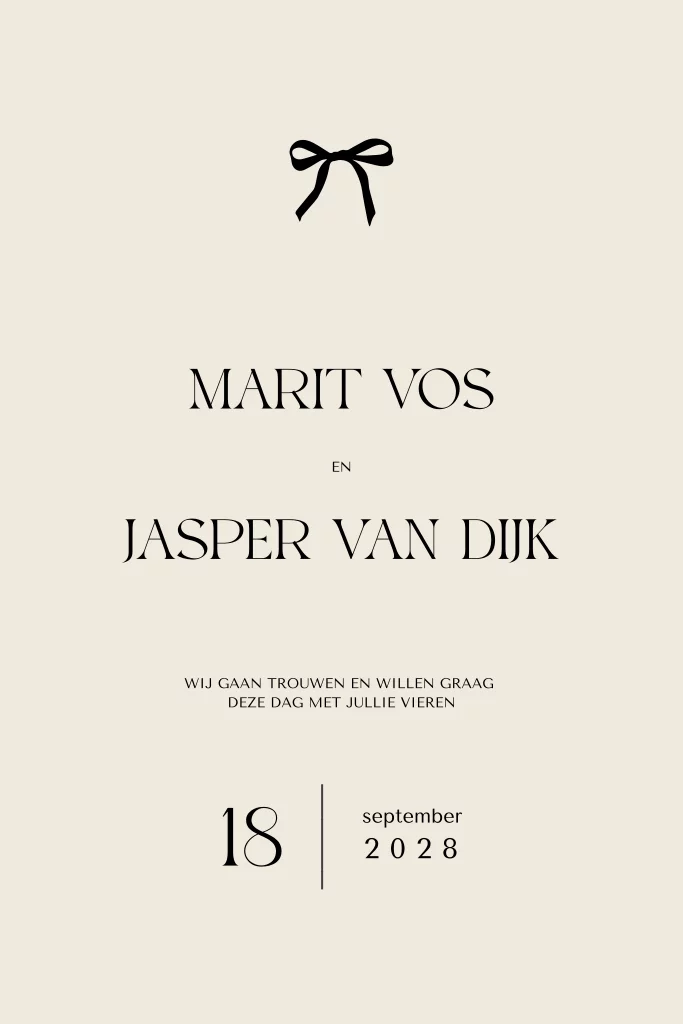 Ontwerp je eigen stijlvolle trouwkaart met een strikje. Deze trouwkaart heeft een zachte zandkleurige achtergrond. Alle teksten, lettertypes en achtergrondkleuren kunnen aangepast worden. Bestel altijd een proefdruk om het resultaat thuis te bekijken. We adviseren voor dit ontwerp het formaat 11 bij 17 cm voor meer allure en een chique uitstraling.