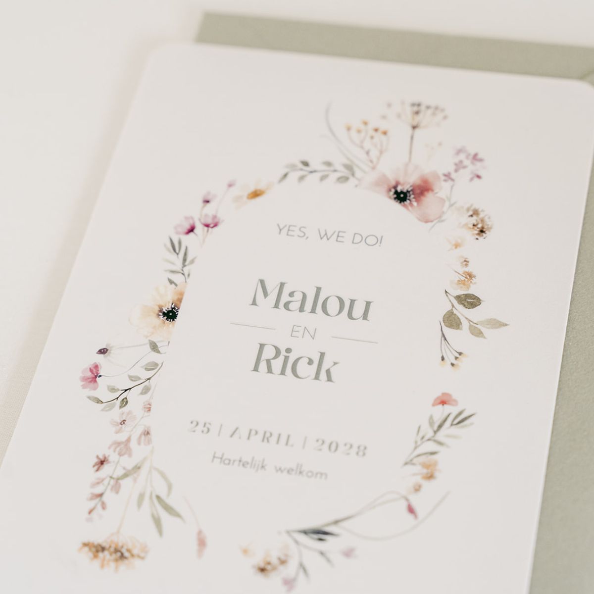 Ontwerp een stijlvolle trouwkaart met een krans van zomerse bloemen. De namen op deze trouwuitnodiging worden in donkergroen hoogglans gedrukt. Liever een andere kleur hoogglans? In de editor pas je eenvoudig de kleuren en teksten aan.