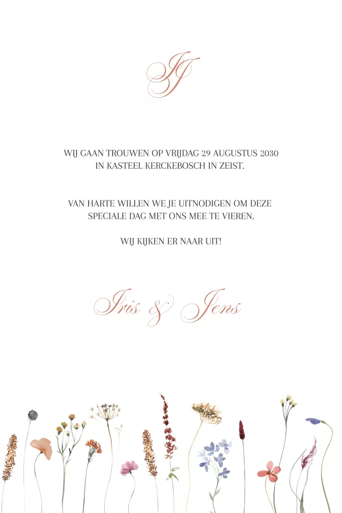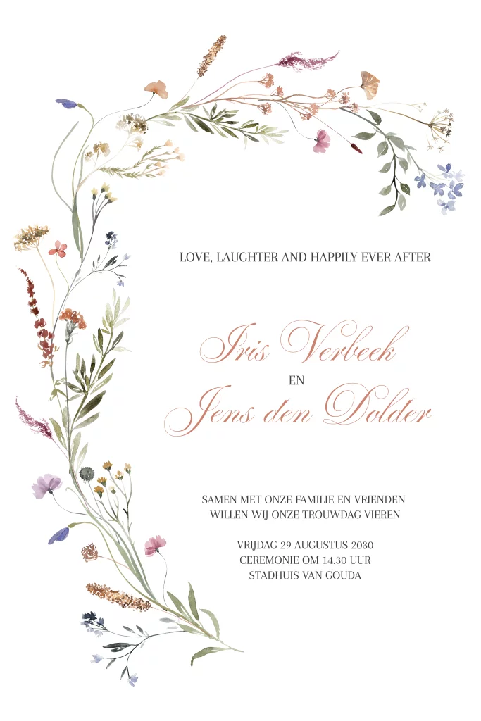 Maak een stijlvolle trouwkaart met illustratie van veldbloemen. Dit is een dubbele trouwuitnodiging, waardoor je alle informatie goed kwijt kan. In de editor maak je eenvoudig een persoonlijk ontwerp.