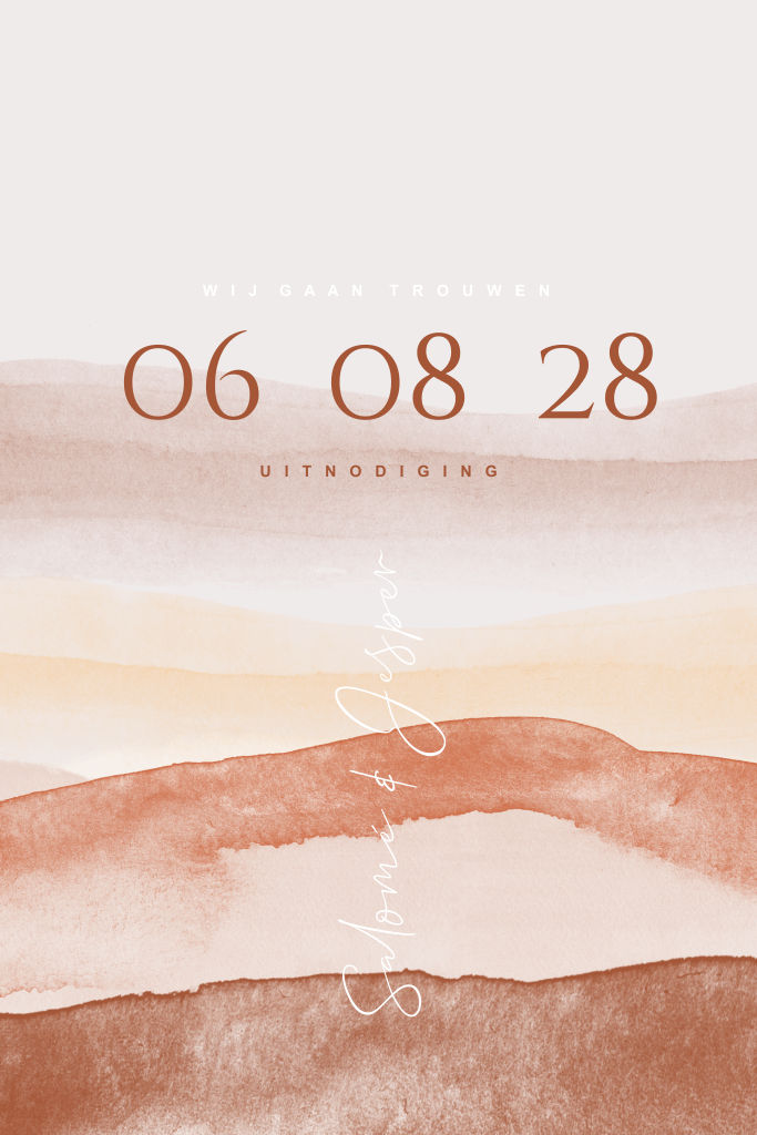 Maak een stijlvolle trouwkaart voor jullie bruiloft met dit ontwerp. Op de voorkant wordt glimmende goudfolie gedrukt. De trouwkaart heeft ronde hoeken die je in de kaartopmaker ook weer recht kunt maken.