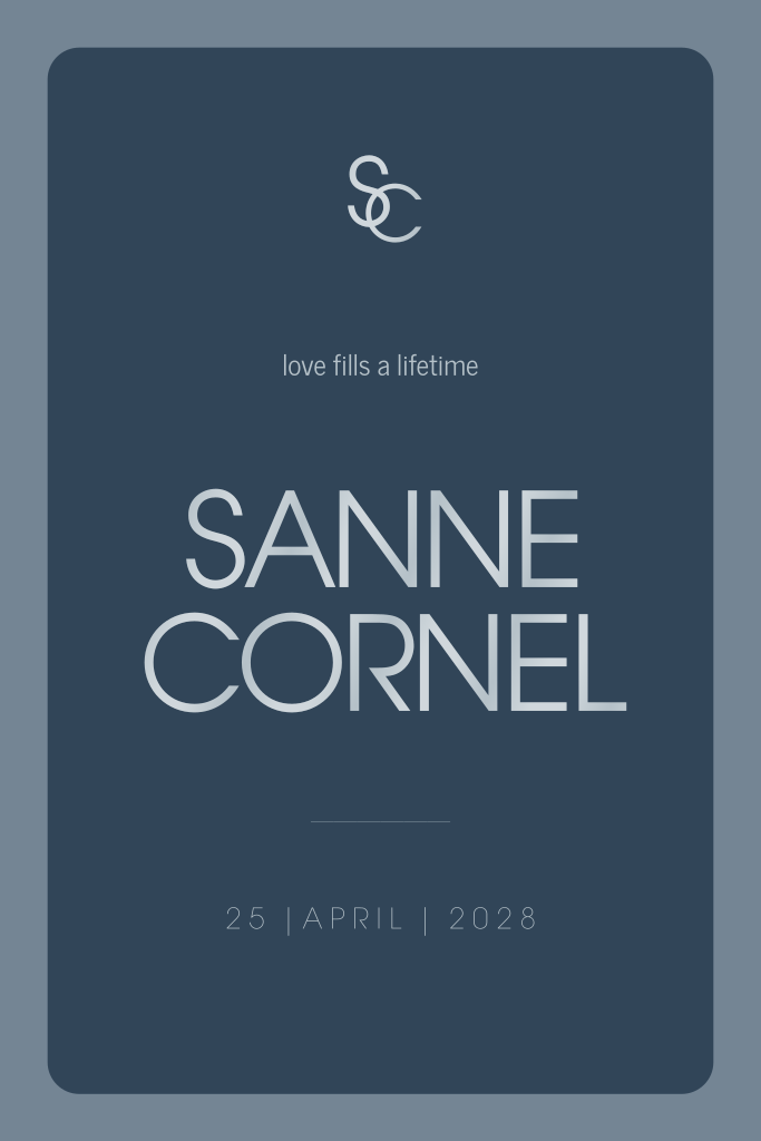 Een stijlvolle uitnodiging voor de bruiloft in donkerblauwe tinten. Op deze trouwkaart wordt een logo van jullie initialen gedrukt. Liever een andere tint trouwkaart? Pas de kleuren en teksten eenvoudig aan in de editor.