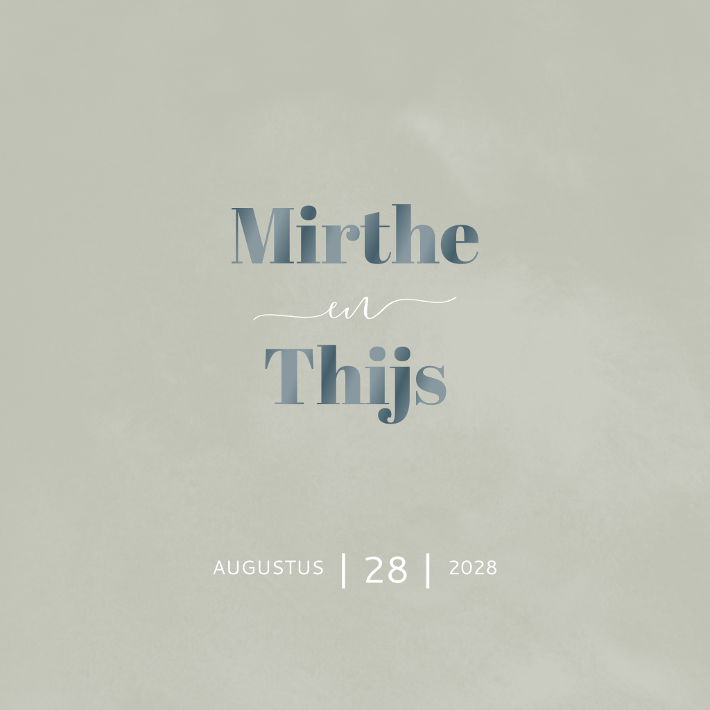 Maak je eigen stijlvolle uitnodiging voor de bruiloft in groen met blauw. De achtergrond heeft een mooie vergrijsde tint en de letters worden met een glimmende blauwe lak gedrukt.
