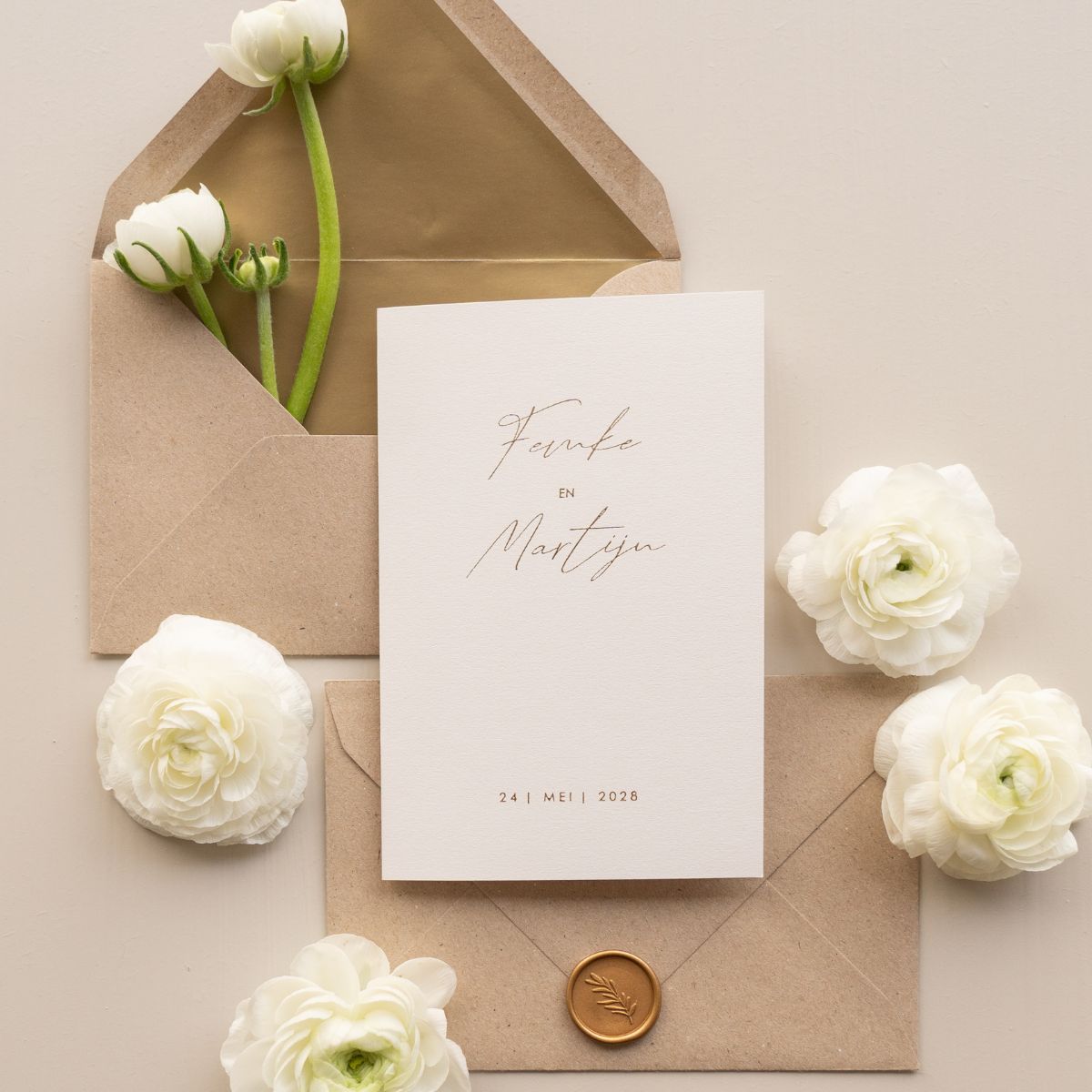 Een stijlvolle trouwuitnodiging met tekst in goudfolie. Om deze trouwkaart zou je een wikkel kunnen vouwen met daartussen een droogbloem. De wikkel kun je bij ons bestellen. Een droogbloemetje mag je zelf regelen. De achtergrondkleur geeft op elk papiersoort een ander resultaat dus bestel altijd een proefdruk.