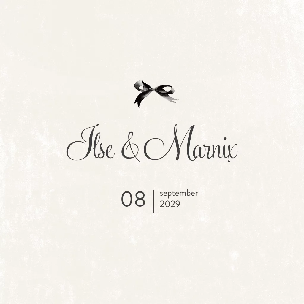 Ontwerp een prachtige trouwuitnodiging voor jullie bijzondere dag! Deze beige trouwuitnodiging met een strikje past bij een stijlvolle trouwdag. De vierkante kaart is dubbelgevouwen, waardoor er voldoende ruimte is om alle belangrijke informatie over jullie trouwdag te noemen.