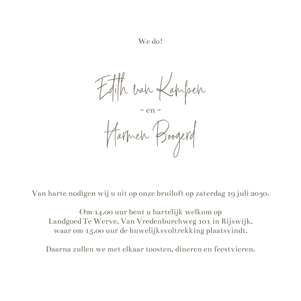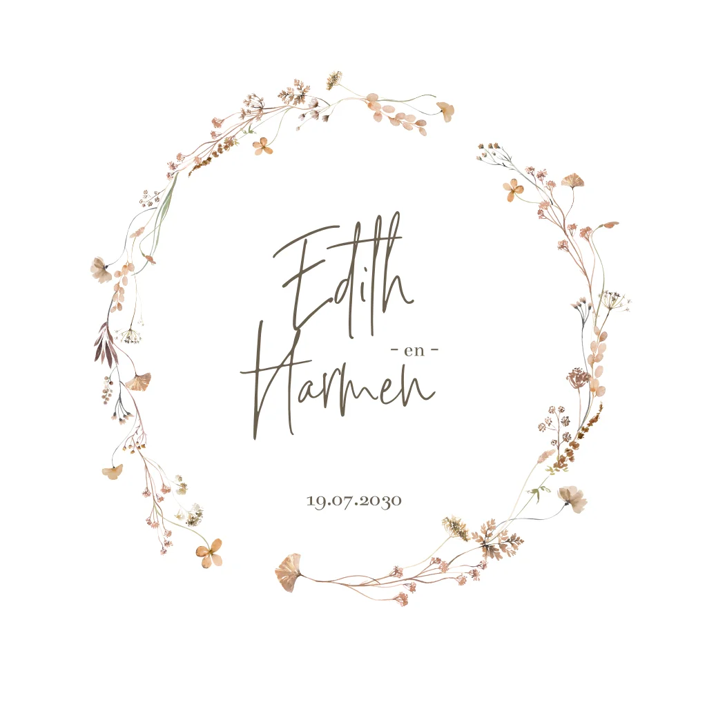 Maak een trouwkaart met bloemenkrans. Dit is een trouwuitnodiging met naturel tinten. De kaart is vierkant en dubbel, hierdoor heb je genoeg ruimte voor alle informatie. In de editor kan je de teksten aanpassen, zo maak je altijd een persoonlijke trouwkaart.