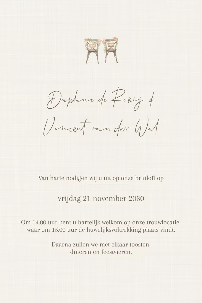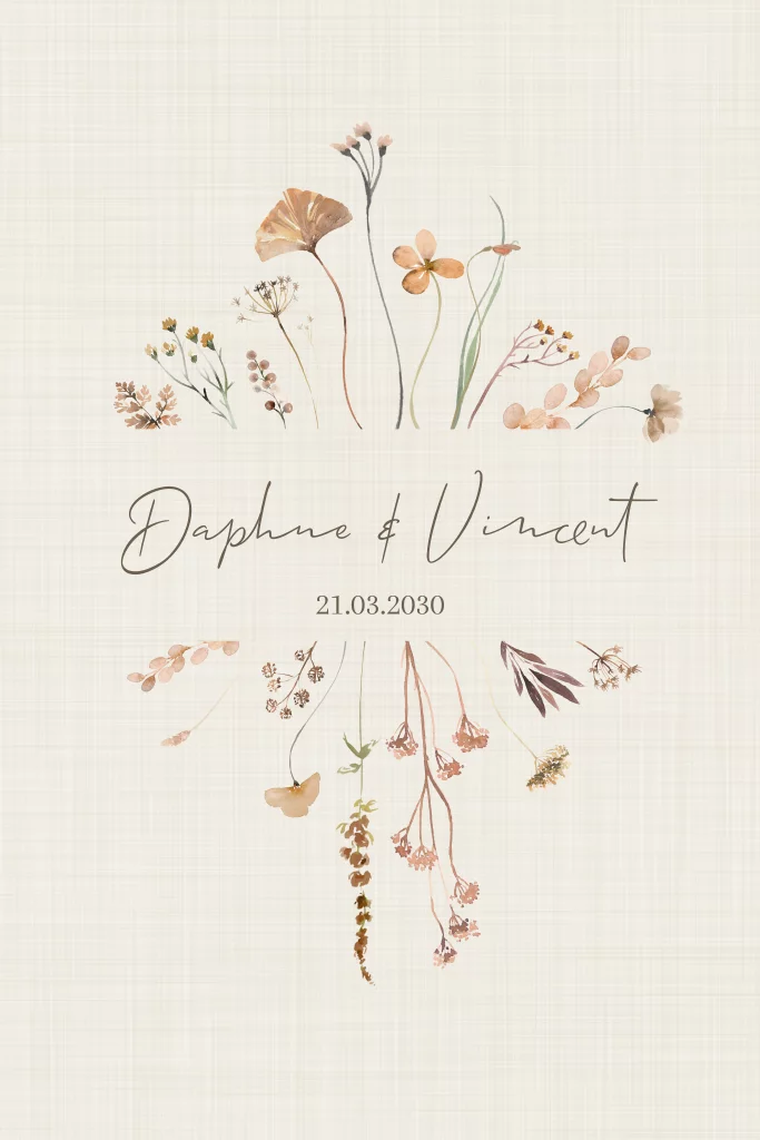 Ontwerp een romantische trouwkaart in linnenlook. Op de kaart staan illustraties van bloemen in naturel tinten. De trouwuitnodiging is dubbel, waardoor je genoeg ruimte hebt voor alle informatie.