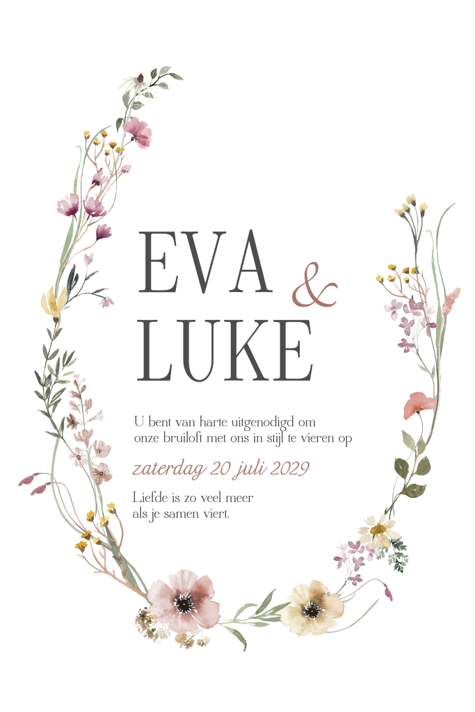Een stijlvolle trouwkaart met een halve krans van bloemen. Liever andere bloemen? De illustraties, teksten en kleuren pas je gemakkelijk aan in de editor. Zo maak je altijd een persoonlijke trouwkaart.