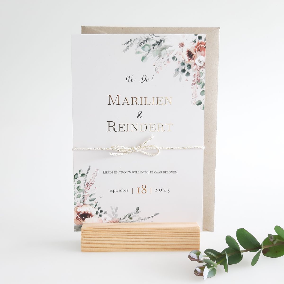 Een romantische trouwkaart met bloemen Je kunt een touwtje om deze trouwkaart strikken. Teksten wordt met goudfolie gedrukt. Dit is een enkele trouwkaart die je in verschillende formaten kunt bestellen. Onze donkergroene of roestbruine envelop past mooi bij deze trouwkaart.