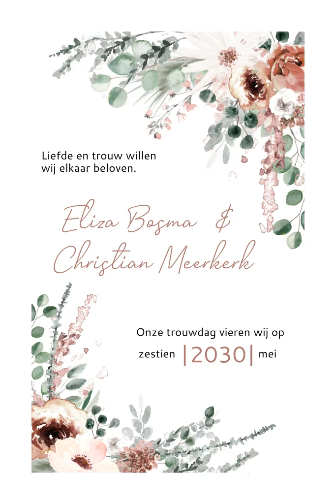 Een bloemen trouwkaart die je zelf kunt ontwerpen in onze kaartopmaker.