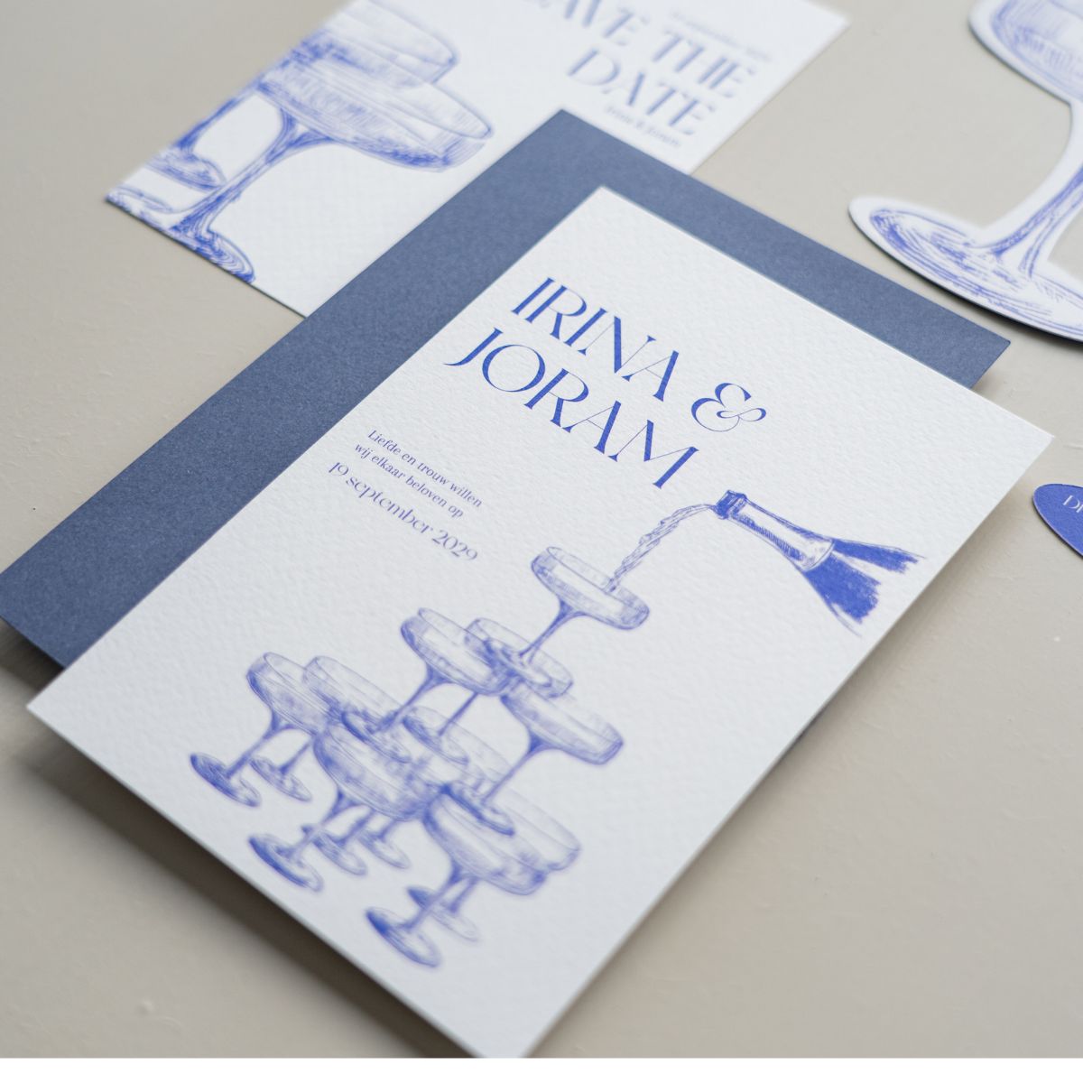 Bestel een trend trouwkaart voor jullie bruiloft. Deze trouwkaart bruiloft met champagnetoren past perfect bij een trouwdag met spetterend huwelijksfeest.