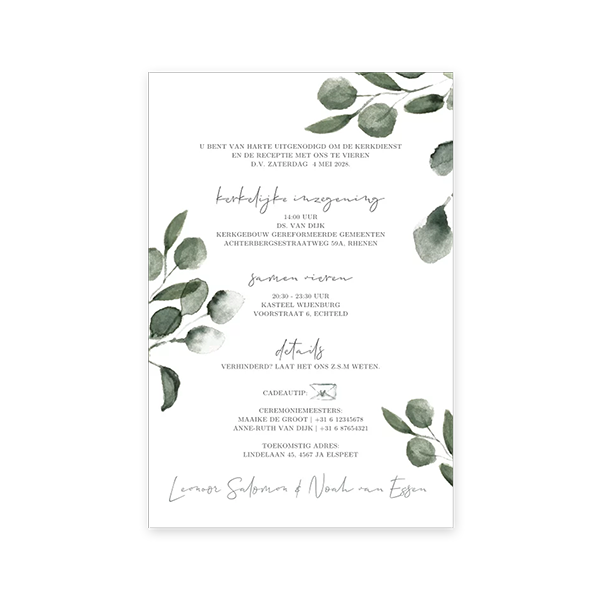 Deze trouwkaart is van papier en hoort bij een kaart van kalkpapier. Kalkpapier is een doorschijnend materiaal dus kan alleen de voorkant bedrukt worden. Door nog een bijpassende kaart bij de kalkpapierkaart te bestellen kun je meer informatie vermelden. Het geeft natuurlijk ook een heel stijlvol en mooi effect.| Totaalprijs: 0 |