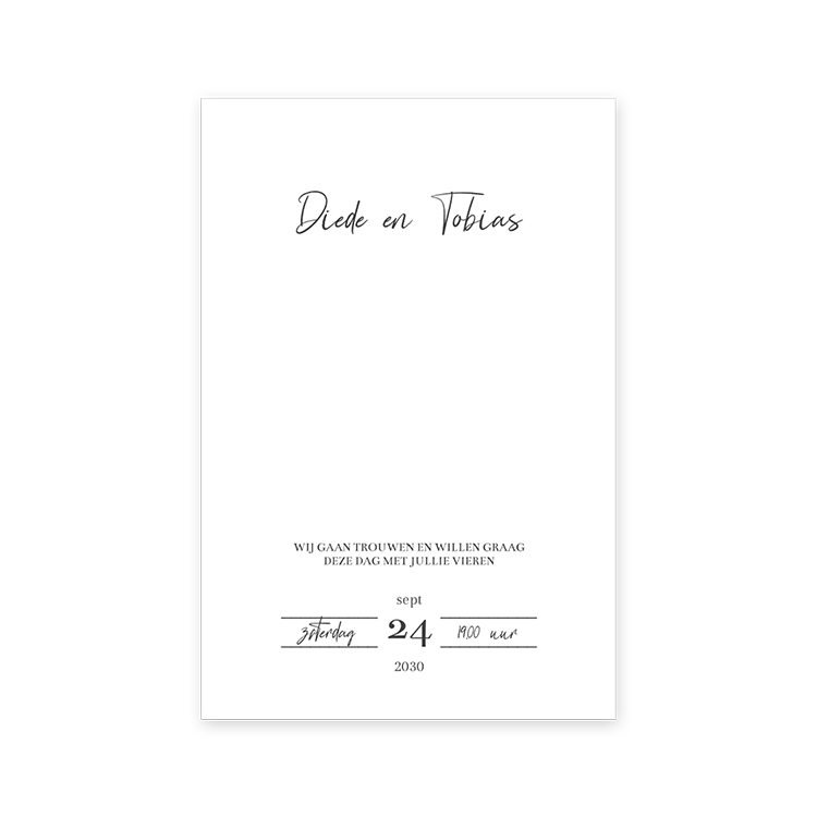 Dit achterblad hoort bij een kalkpapier voorblad met champagnetoren in goudfolie. Op deze klassieke kaart voeg je informatie toe over jullie trouwdag. Voor dit ontwerp heb je een flenstang en ringetjes voor nodig, die je los bij de trouwkaart besteld. Hieronder leggen we uit hoe je de flensringetjes kunt toevoegen.| Totaalprijs: 0 |