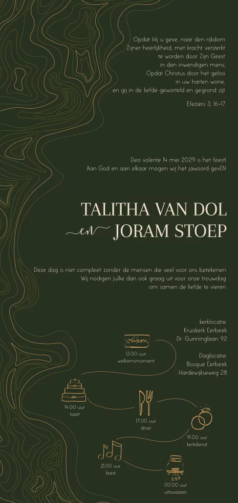 Ontwerp een chique trouwkaart in donkergroene tint. Op de bruiloft uitnodiging kan je met de icoontjes het programma van de trouwdag zetten.